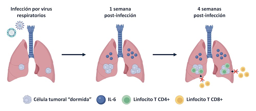 El estudio encontró que, en modelos animales con cáncer de mama que ha formado metástasis en los pulmones, la infección por virus de la gripe o la covid-19 aumentó rápidamente los niveles de IL-6, y con ello, el número de células tumorales activas.