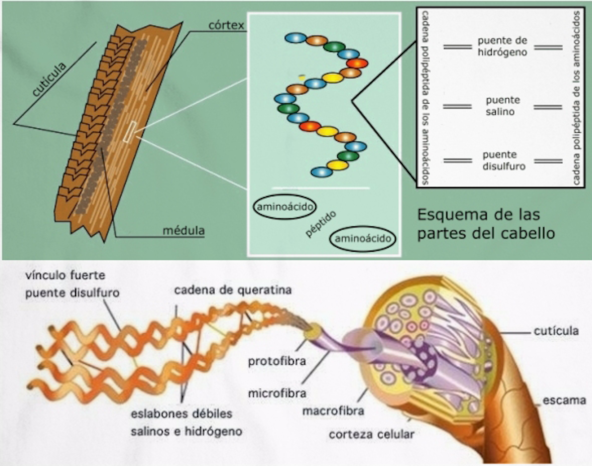 Cada mechón está formado, principalmente, por queratina , una proteína fibrosa rica en azufre que se acumula, sobre todo, en las capas más externas del tallo capilar: la cutícula y la corteza. Estas zonas aportan resistencia, elasticidad y forma al cabello, y, por ello, son las más sensibles a la humedad y el calor.